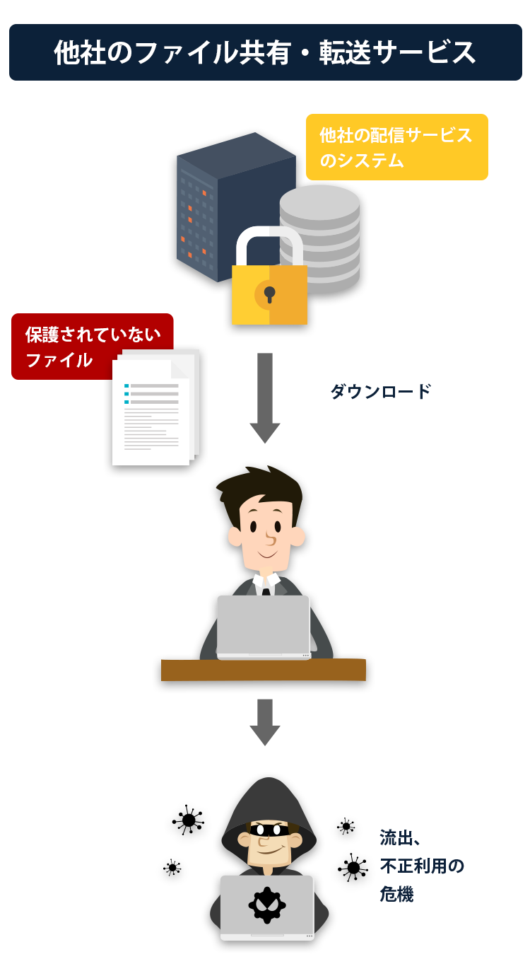 従来の暗号化ソリューションと違い、最大の特徴はIRM(Information Rights Management)という技術を使うことによって相手先がファイルをダウンロードして開いた後まで管理・制限が続くことです。